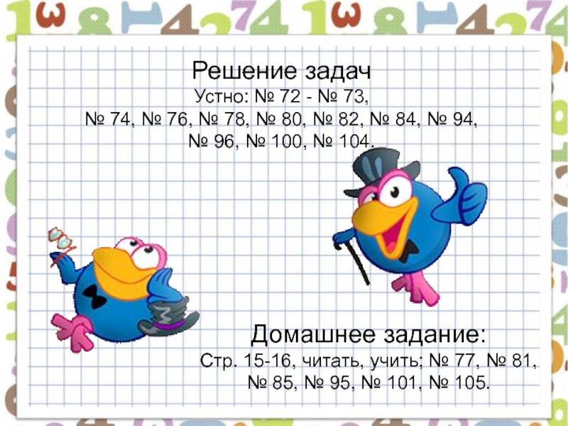 Стр. 15-16, читать, учить; № 77, № 81, № 85, № 95, № 101, № 105.