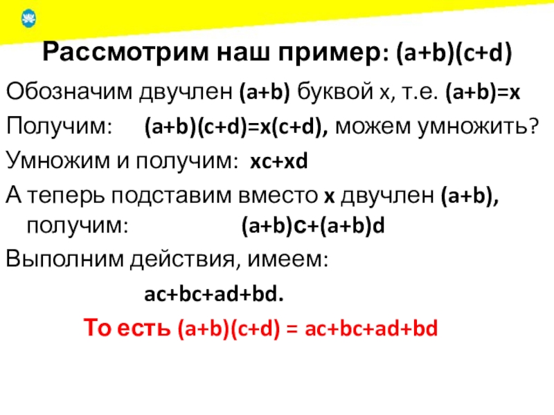 Рассмотрим наш пример: (a+b)(c+d)Обозначим двучлен (a+b) буквой x, т.е. (a+b)=xПолучим: 	(a+b)(c+d)=x(c+d), можем умножить?Умножим и получим: xc+xd А