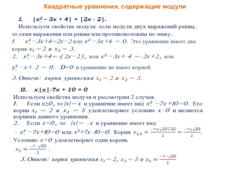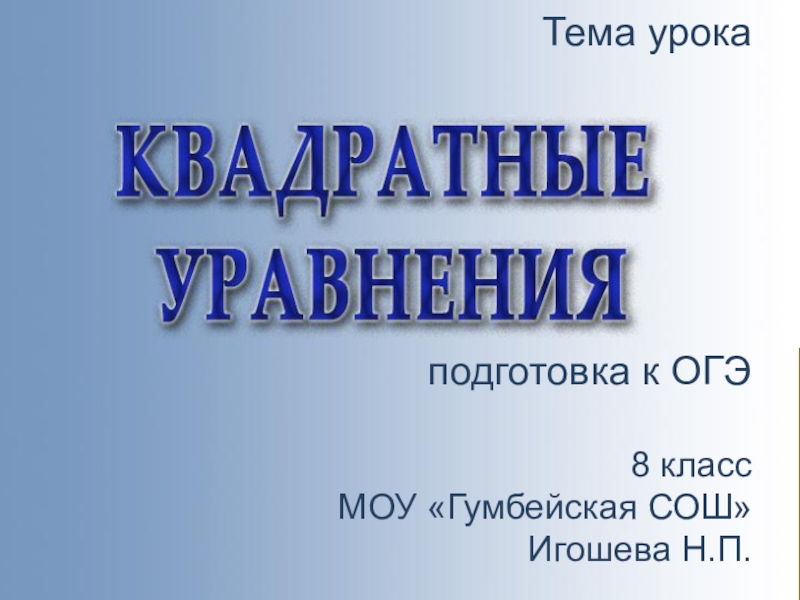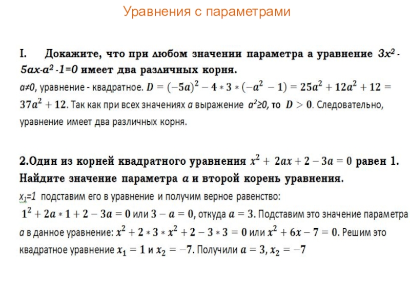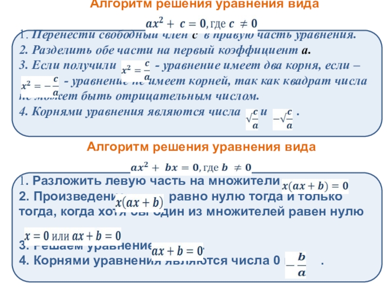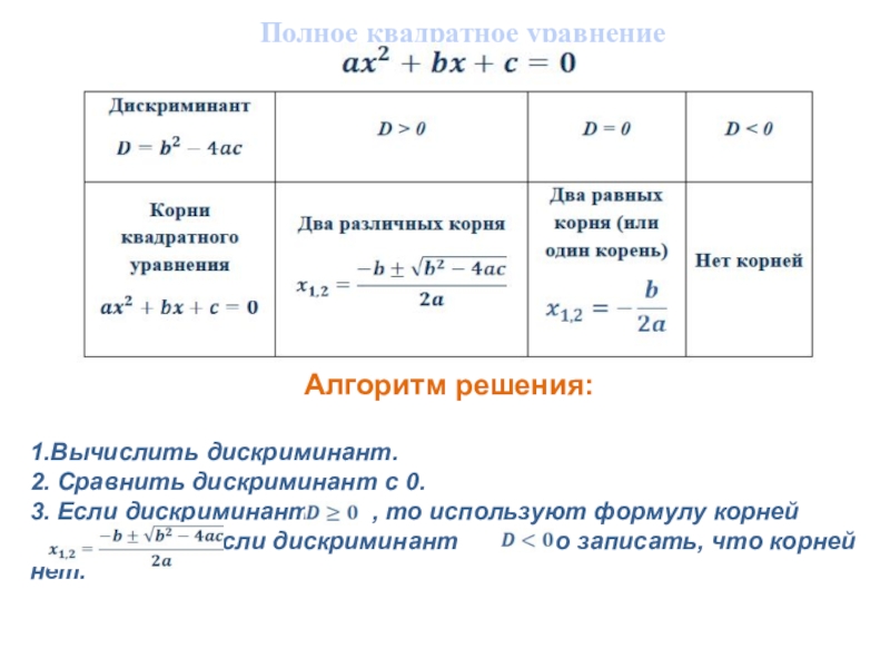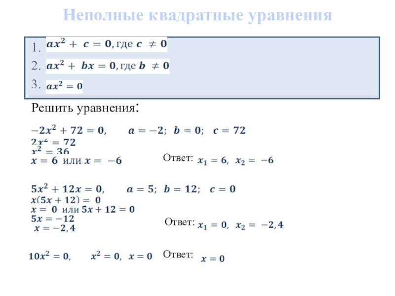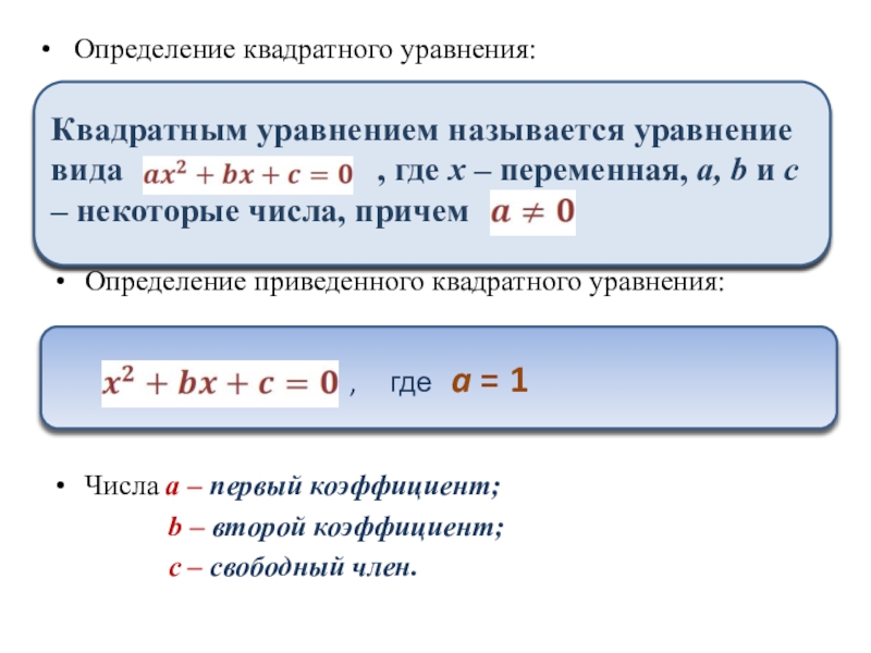 Квадратным уравнением называется уравнение вида , где х – переменная, a, b и c – некоторые числа, причем