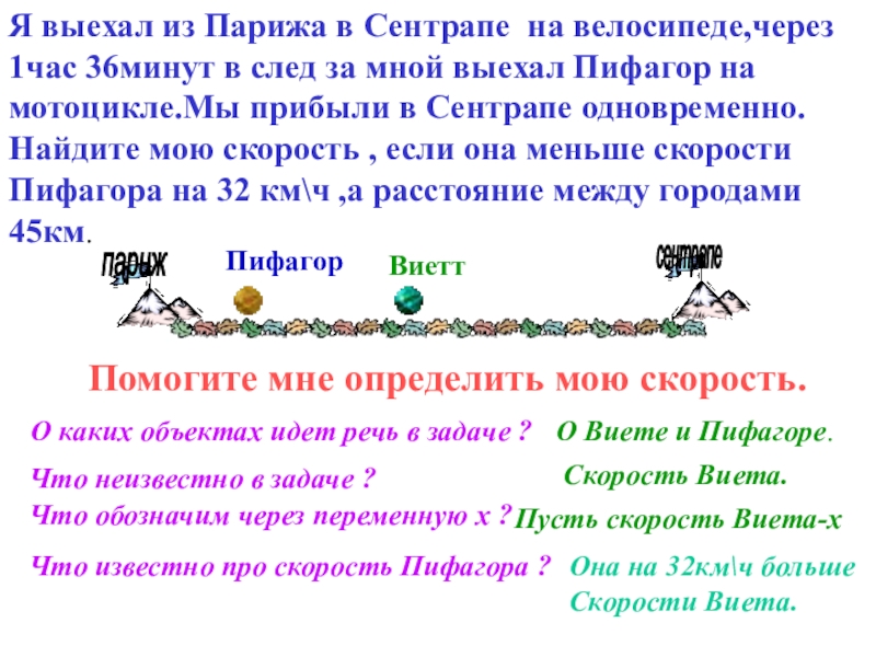 По условию задачи Пифагор на 1ч 36 мин. выехал позже Виета.