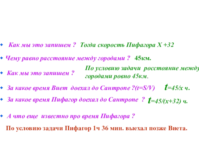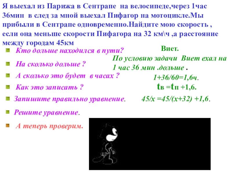 По условию задачи Пифагор 1ч 36 мин. выехал позже Виета.