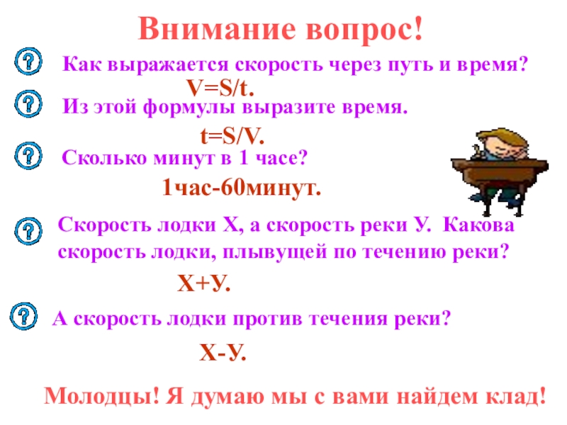 Теперь я ,зная скорость реки, быстрее доберусь до клада.