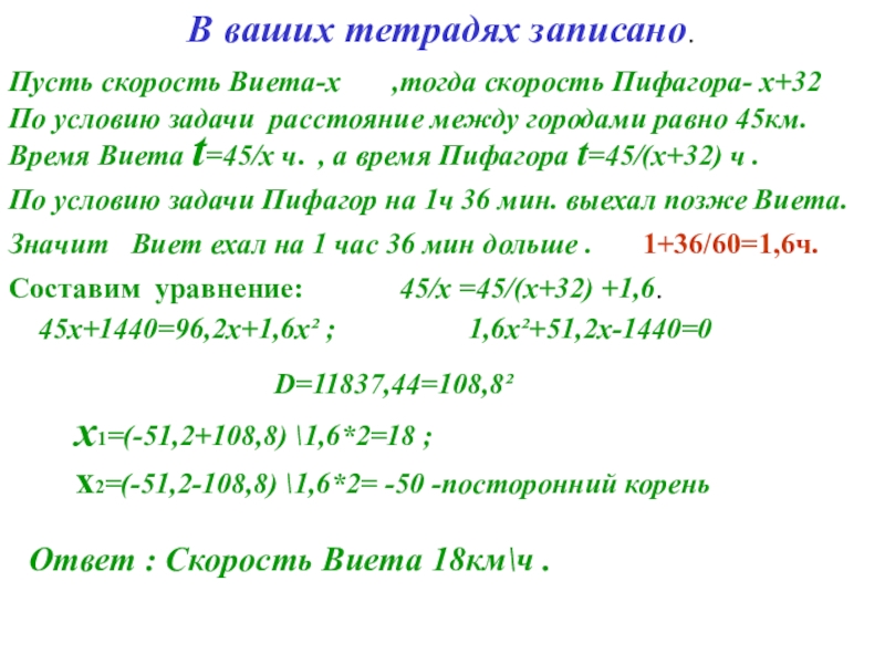 45х+1440=96,2х+1,6х² ; 1,6х²+51,2х-1440=0