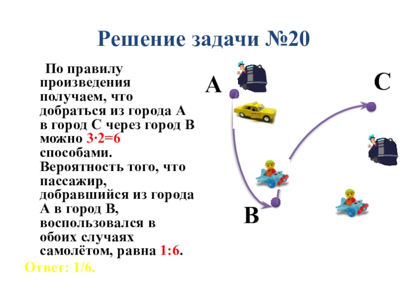 в город С через город В можно 3∙2=6 способами. Вероятность того, что пассажир, добравшийся из города А в город В, воспользовался в обоих случаях самолётом, равна 1:6.