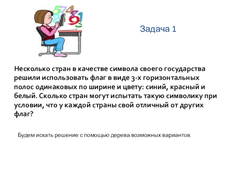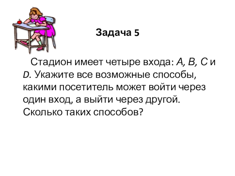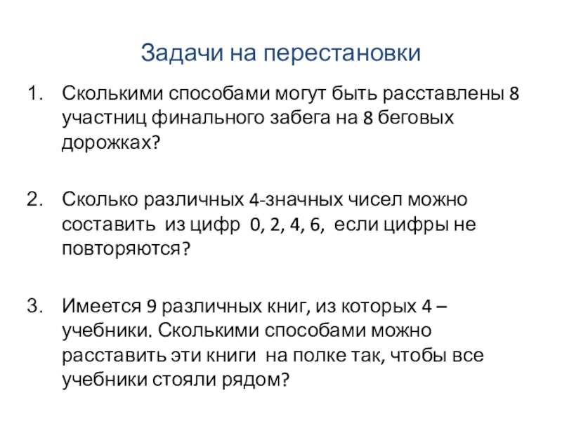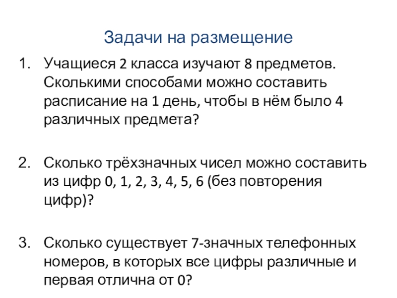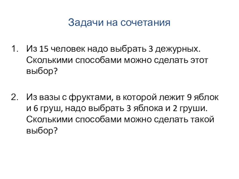 Типичной задачей комбинаторики является задача перечисления комбинаций, составленных из нескольких предметов.