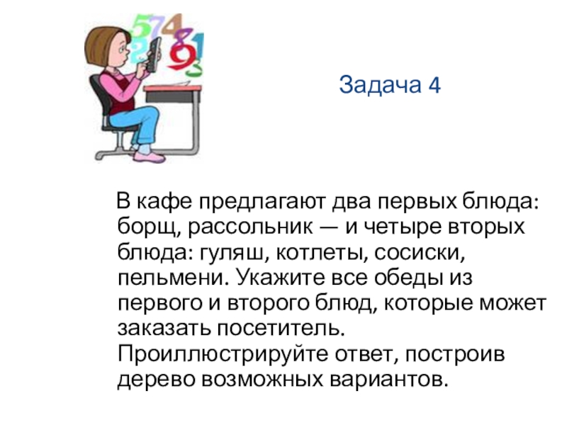 — и четыре вторых блюда: гуляш, котлеты, сосиски, пельмени. Укажите все обеды из первого и второго блюд, которые может заказать посетитель. Проиллюстрируйте ответ, построив дерево возможных вариантов.