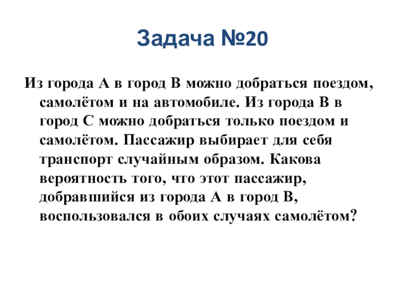 и на автомобиле. Из города В в город С можно добраться только поездом и самолётом. Пассажир выбирает для себя транспорт случайным образом. Какова вероятность того, что этот пассажир, добравшийся из города А в город В, воспользовался в обоих случаях самолётом?