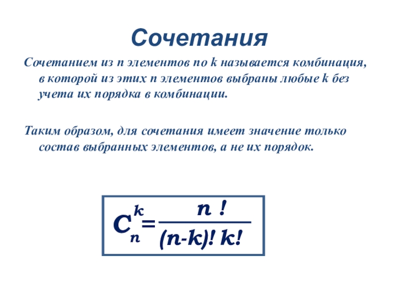 Сочетанием из n элементов по k называется комбинация, в которой из