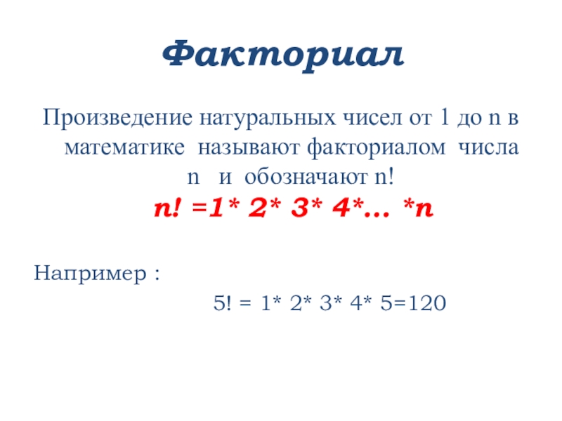 Произведение натуральных чисел от 1 до n в математике называют факториалом