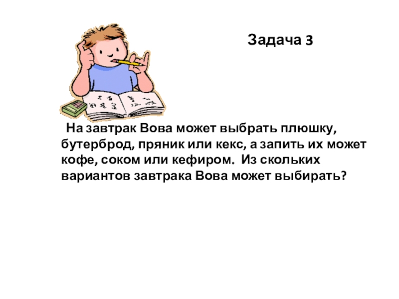 а запить их может кофе, соком или кефиром. Из скольких вариантов завтрака Вова может выбирать?