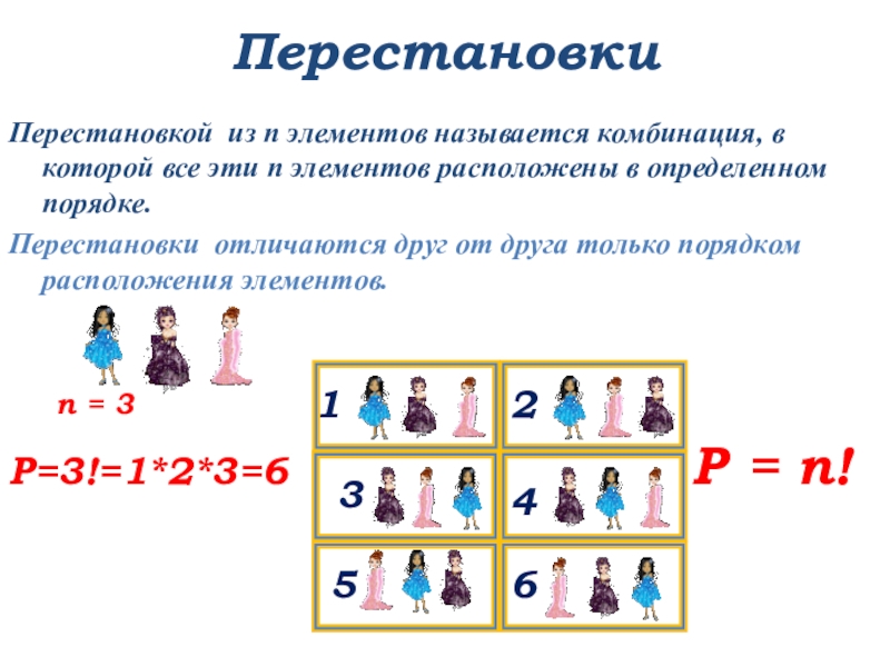 Перестановкой из n элементов называется комбинация, в которой все эти n