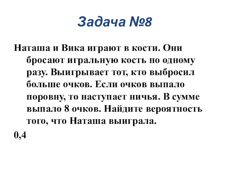 по одному разу. Выигрывает тот, кто выбросил больше очков. Если очков выпало поровну, то наступает ничья. В сумме выпало 8 очков. Найдите вероятность того, что Наташа выиграла.