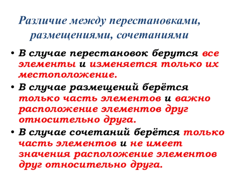 Слайд 21Различие между перестановками, размещениями, сочетаниями
