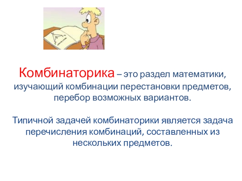 Слайд 2Комбинаторика – это раздел математики, изучающий комбинации перестановки предметов, перебор возможных