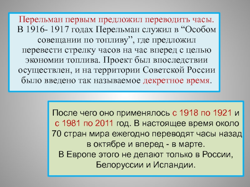 В 1916- 1917 годах Перельман служил в “Особом совещании по топливу”, где предложил перевести стрелку часов на час вперед с целью экономии топлива. Проект был впоследствии осуществлен, и на территории Советской России было введено так называемое декретное время.