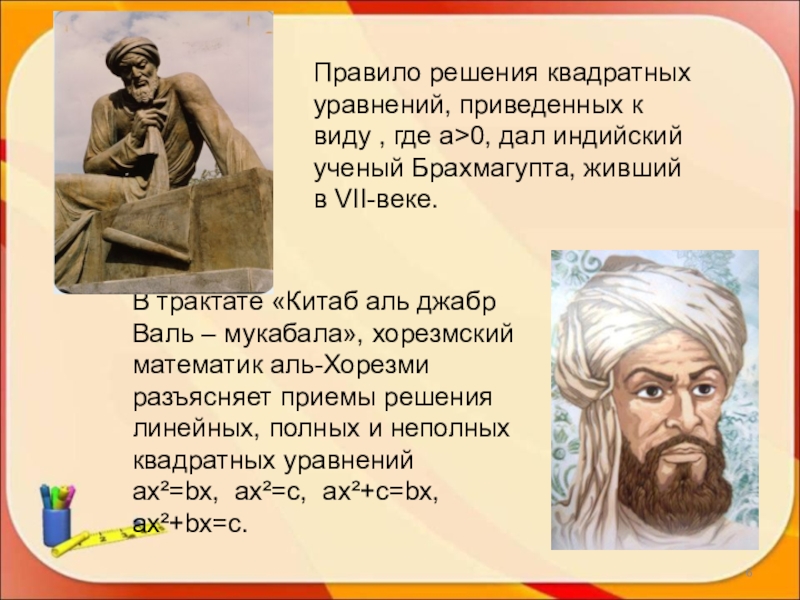 В трактате «Китаб аль джабр Валь – мукабала», хорезмский математик аль-Хорезми разъясняет приемы решения линейных, полных и неполных квадратных уравнений ax²=bx, ax²=c, ax²+c=bx, ax²+bx=c.