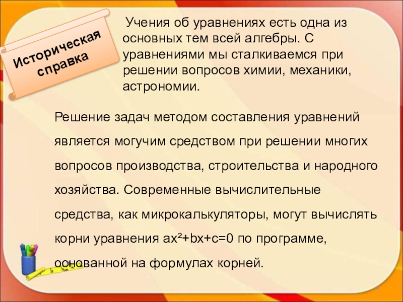 Решение задач методом составления уравнений является могучим средством при решении многих вопросов производства, строительства и народного хозяйства. Современные вычислительные средства, как микрокалькуляторы, могут вычислять корни уравнения ax²+bx+c=0 по программе, основанной на формулах корней.