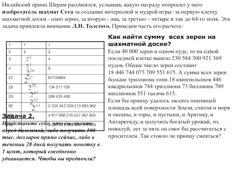 Если 40 000 зерен в одном пуде, то на одной последней клетке вышло 230 584 300 921 369 пудов. Общее число зерен составит 18 446 744 073 709 551 615. А сумма всех зерен больше триллиона тонн.18 квинтильонов 446 квадрильонов 744 триллиона 73 биллиона 709 миллионов 551 тысяча 615.