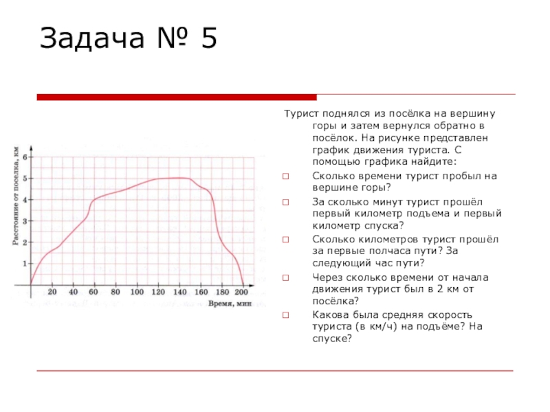 Задача № 5Турист поднялся из посёлка на вершину горы и затем вернулся обратно в посёлок. На рисунке