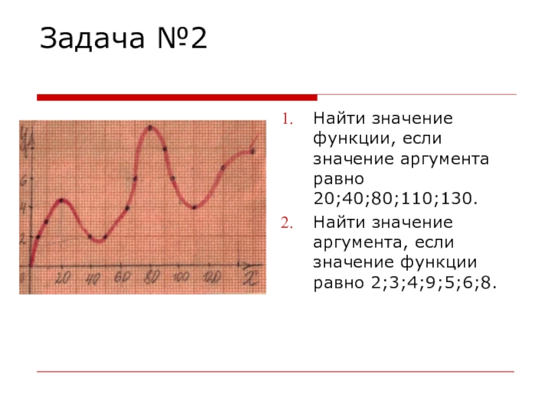 Задача №2Найти значение функции, если значение аргумента равно 20;40;80;110;130.Найти значение аргумента, если значение функции равно 2;3;4;9;5;6;8.