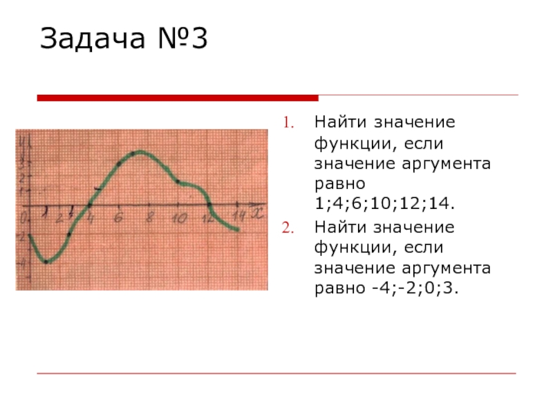 Задача №3Найти значение функции, если значение аргумента равно 1;4;6;10;12;14.Найти значение функции, если значение аргумента равно -4;-2;0;3.