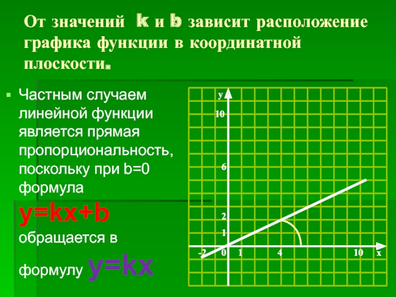 Частным случаем линейной функции является прямая пропорциональность, поскольку при b=0 формула y=kx+b обращается в формулу y=kx