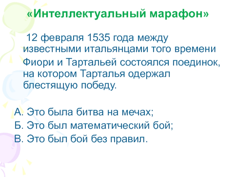 Фиори и Тартальей состоялся поединок, на котором Тарталья одержал блестящую победу.
