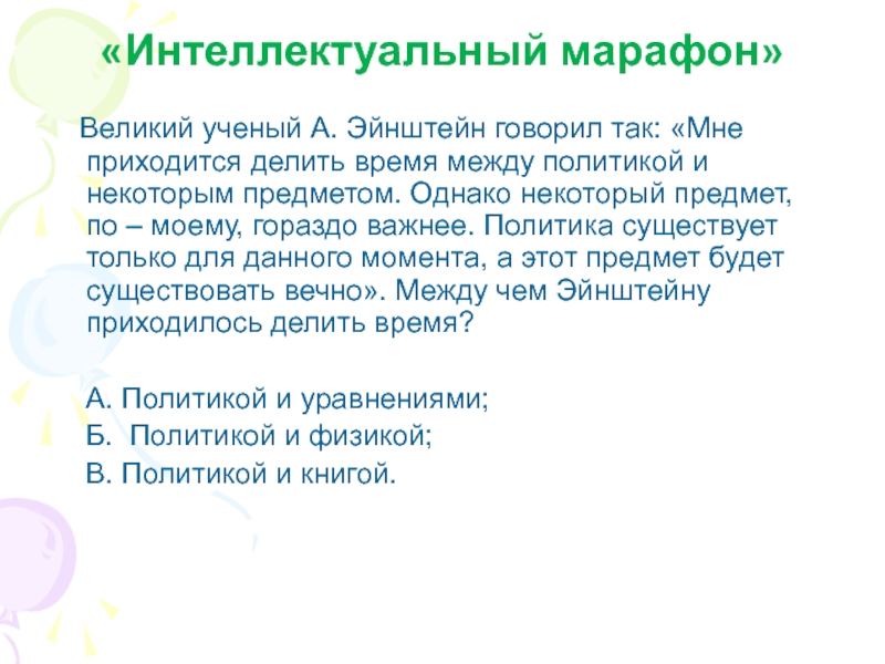 приходится делить время между политикой и некоторым предметом. Однако некоторый предмет, по – моему, гораздо важнее. Политика существует только для данного момента, а этот предмет будет существовать вечно». Между чем Эйнштейну приходилось делить время?