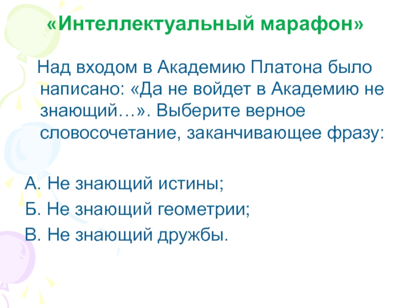 «Да не войдет в Академию не знающий…». Выберите верное словосочетание, заканчивающее фразу: