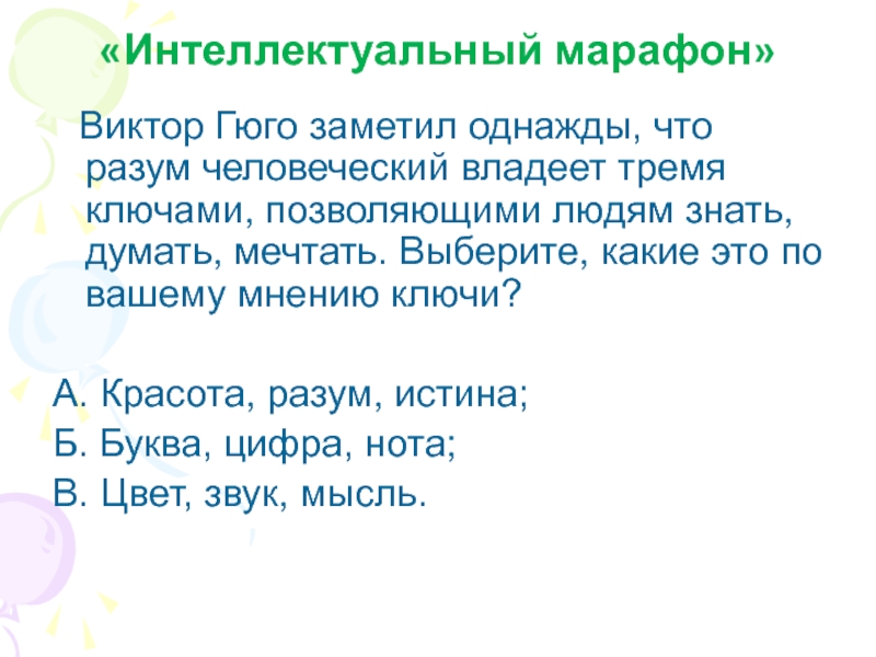 владеет тремя ключами, позволяющими людям знать, думать, мечтать. Выберите, какие это по вашему мнению ключи?