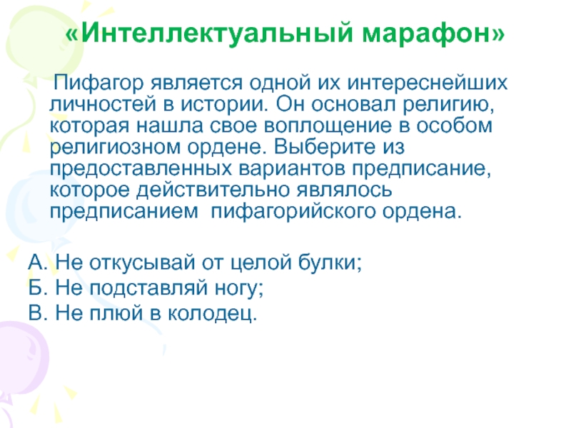 в истории. Он основал религию, которая нашла свое воплощение в особом религиозном ордене. Выберите из предоставленных вариантов предписание, которое действительно являлось предписанием пифагорийского ордена.