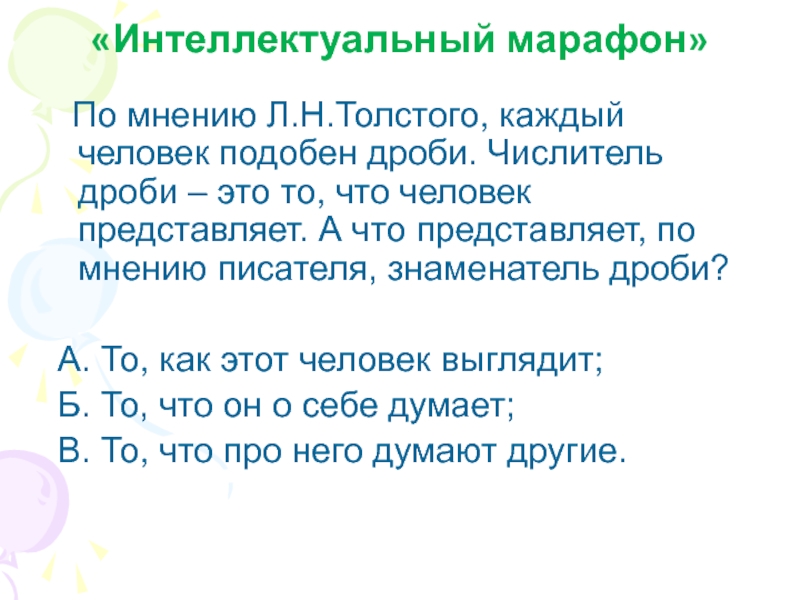 По мнению Л.Н.Толстого, каждый человек подобен дроби.