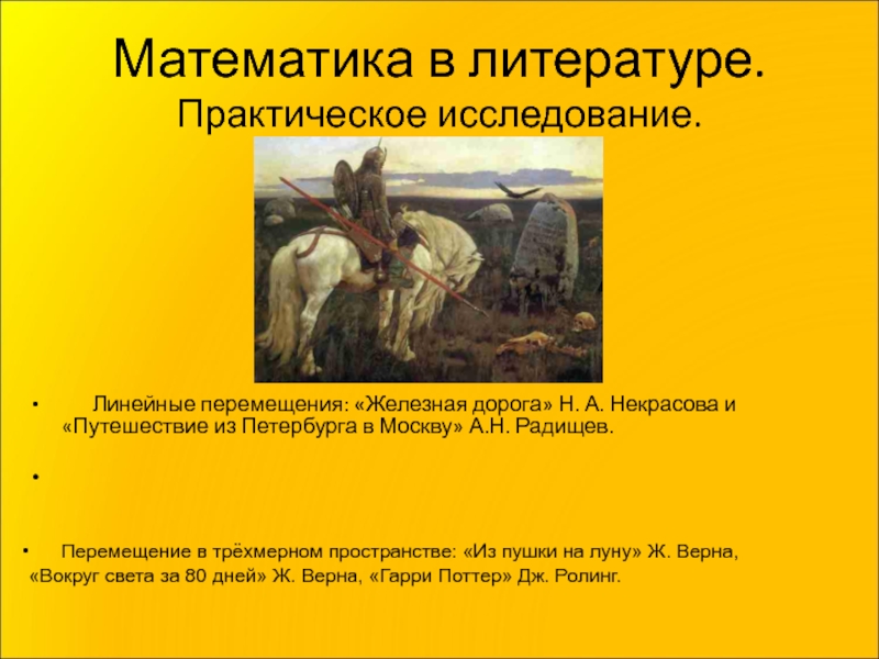 Перемещение по плоскости: «Сентиментальное путешествие» Д. Стерна, «Письма русского путешественника» Н.М. Карамзина, «Дети капитана Гранта» Ж. Верна.