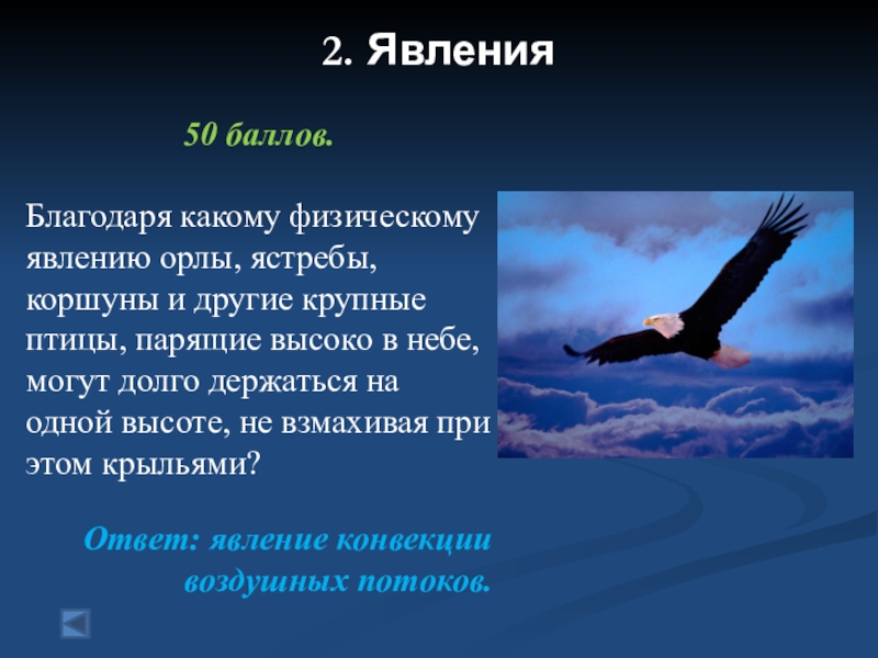 2. Явления  50 баллов.Благодаря какому физическому явлению орлы, ястребы, коршуны и другие крупные птицы, парящие высоко