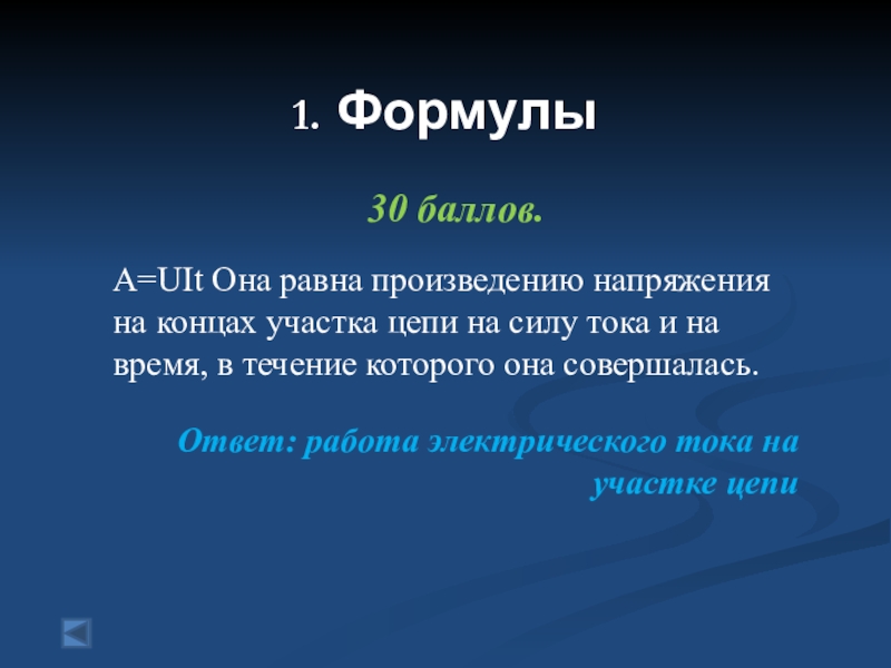1. Формулы30 баллов. A=UIt Она равна произведению напряжения на концах участка цепи на силу тока и