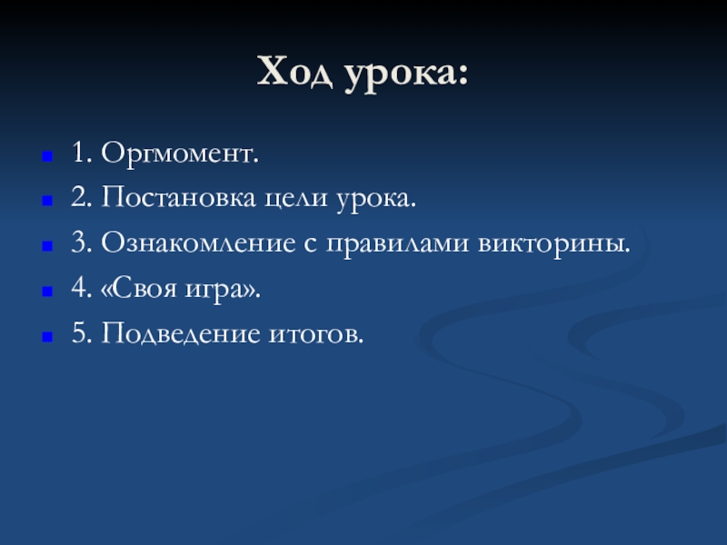 Ход урока:1. Оргмомент.2. Постановка цели урока.3. Ознакомление с правилами викторины.4. «Своя игра».5. Подведение итогов.