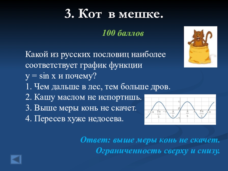 3. Кот в мешке.  100 балловКакой из русских пословиц наиболее соответствует график функции y = sin