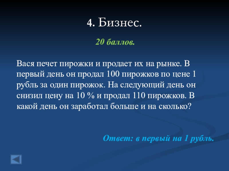 4. Бизнес.20 баллов. Вася печет пирожки и продает их на рынке. В первый день он продал 100