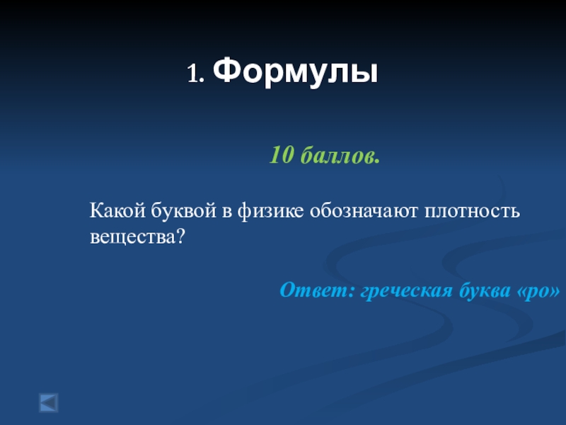 1. Формулы10 баллов. Какой буквой в физике обозначают плотность вещества?Ответ: греческая буква «ро»