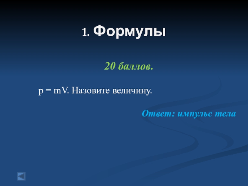 1. Формулы20 баллов.    р = mV. Назовите величину.Ответ: импульс тела