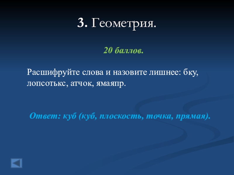 3. Геометрия.20 баллов. Расшифруйте слова и назовите лишнее: бку, лопсотькс, атчок, ямаяпр. Ответ: куб (куб, плоскость, точка,