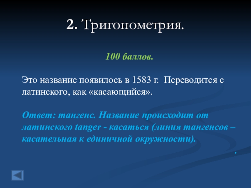2. Тригонометрия. 100 баллов. Это название появилось в 1583 г. Переводится с латинского, как «касающийся». Ответ: тангенс.
