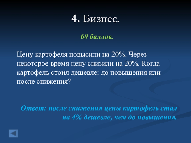 4. Бизнес.60 баллов. Цену картофеля повысили на 20%. Через некоторое время цену снизили на 20%. Когда картофель