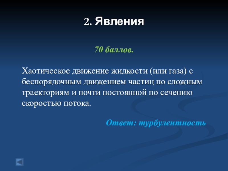 2. Явления70 баллов. Хаотическое движение жидкости (или газа) с беспорядочным движением частиц по сложным траекториям и почти
