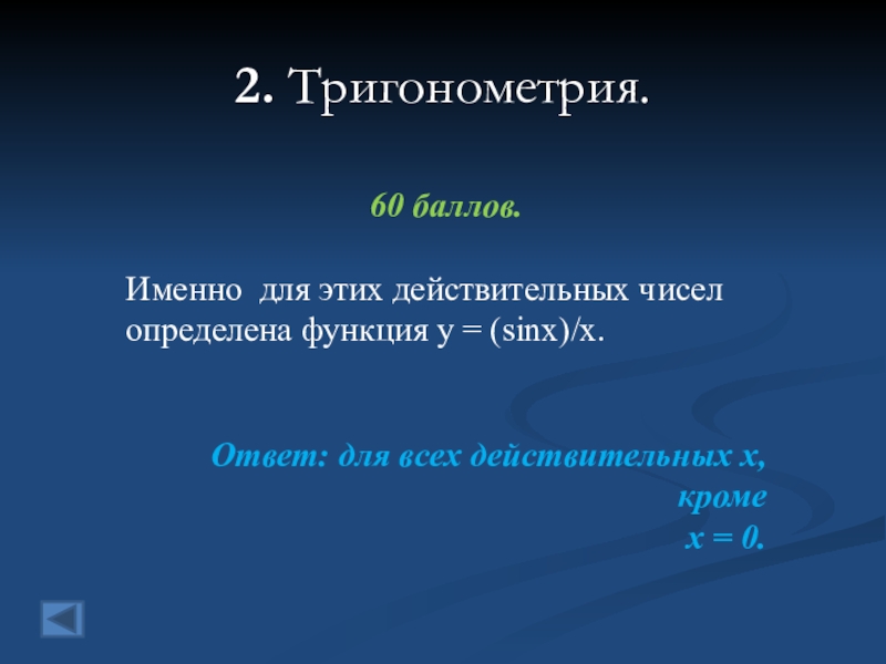 2. Тригонометрия. 60 баллов. Именно для этих действительных чисел определена функция y = (sinx)/x. Ответ: для всех