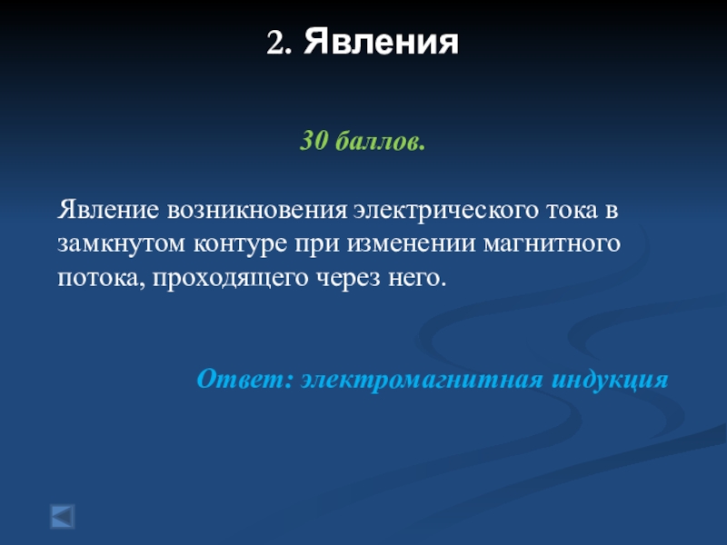 2. Явления  30 баллов. Явление возникновения электрического тока в замкнутом контуре при изменении магнитного потока, проходящего