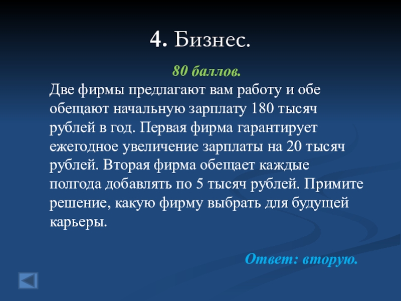 4. Бизнес.80 баллов.Две фирмы предлагают вам работу и обе обещают начальную зарплату 180 тысяч рублей в год.