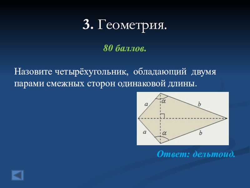 3. Геометрия.80 баллов. Назовите четырёхугольник, обладающий двумя парами смежных сторон одинаковой длины. Ответ: дельтоид.