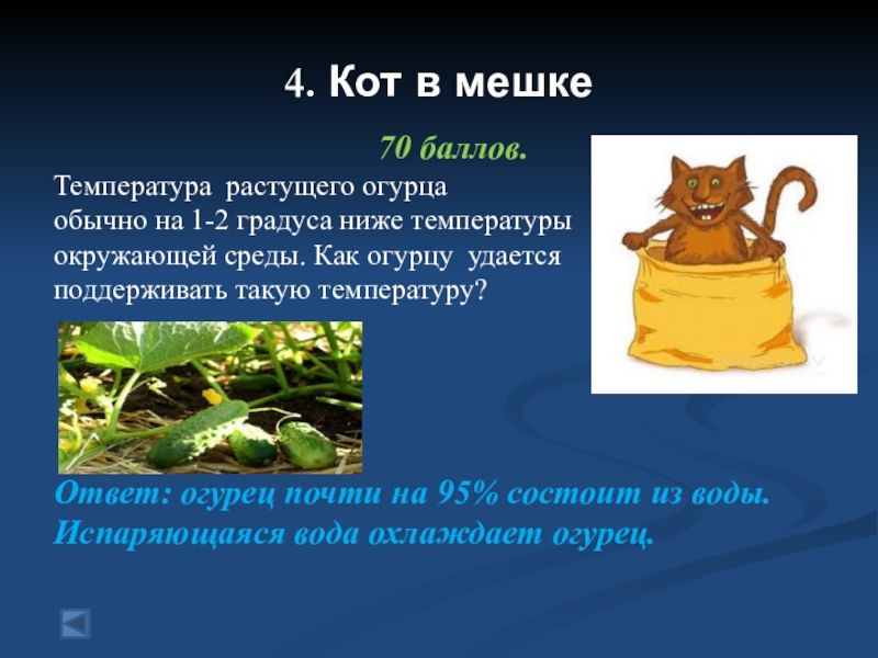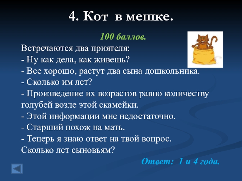 4. Кот в мешке.   100 баллов.Встречаются два приятеля: - Ну как дела, как живешь?