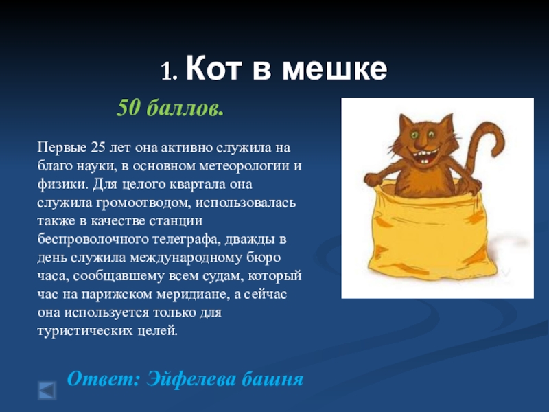 1. Кот в мешке50 баллов. Первые 25 лет она активно служила на благо науки, в основном